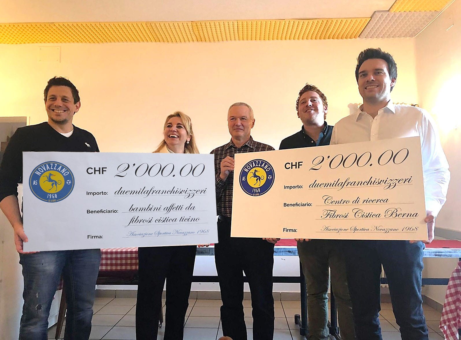 Da sinistra: Davide Rezzonico membro comitato AS Novazzano, Fiorella Pezzotti e Franz Schuler responsabili associazione Fibrosi Cistica Svizzera italiana, Davide Franzoi organizzatore raccolta fondi Fibrosi Cistica , Pierre Sandrinelli vicepresidente AS Novazzano.